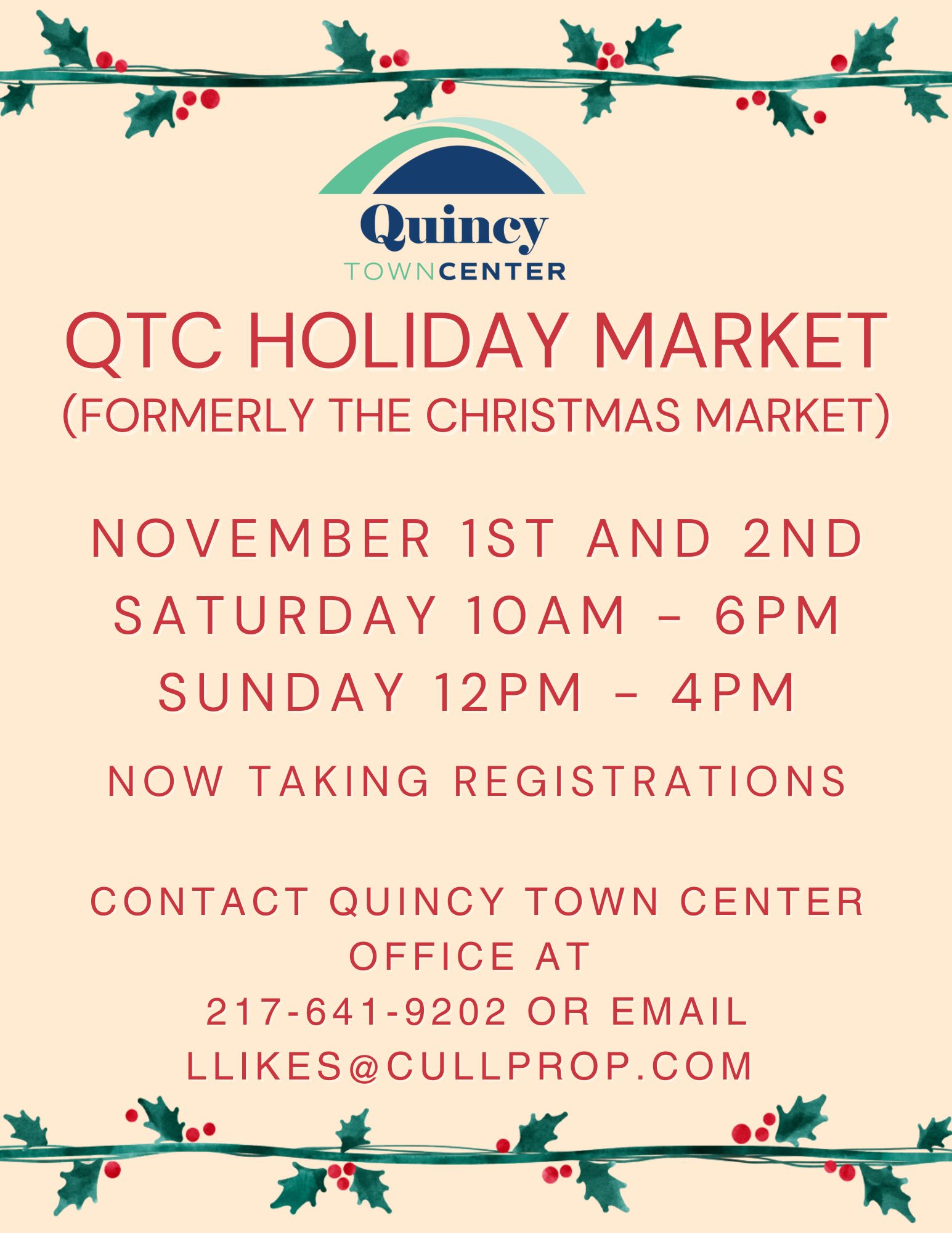 QTC Holiday Market (Formerly The Quincy Christmas Pickers Market), November 1st, 10am – 6pm, November 2nd, 12pm – 4pm.